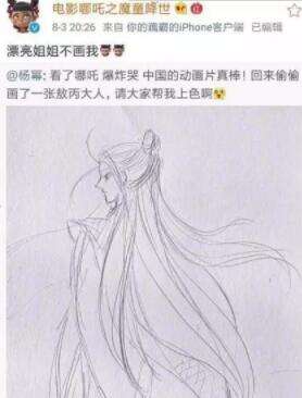随着电影的热映,话题讨论不断,各路明星路人争相cos哪吒形象,画哪吒漫画。前几天,杨幂在微博晒出一张敖丙的素描图,称自己刚看完爆炸哭,还请求网友帮其画上色。