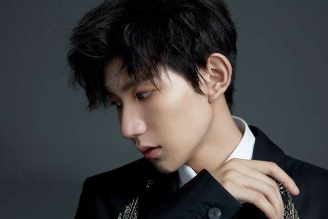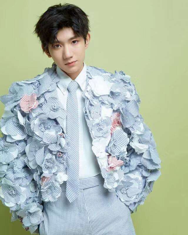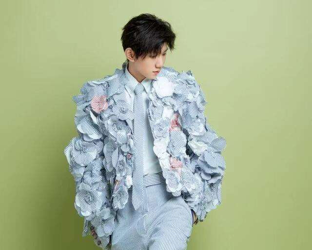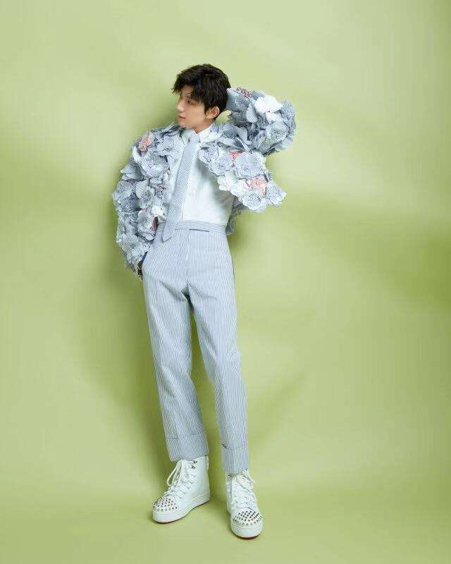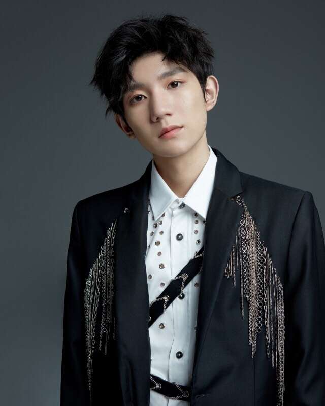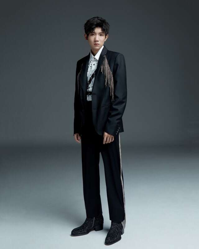 标题:歌手王源金属链条装饰西装内搭铆钉衬衫,全黑造型的摇滚形象超帅!