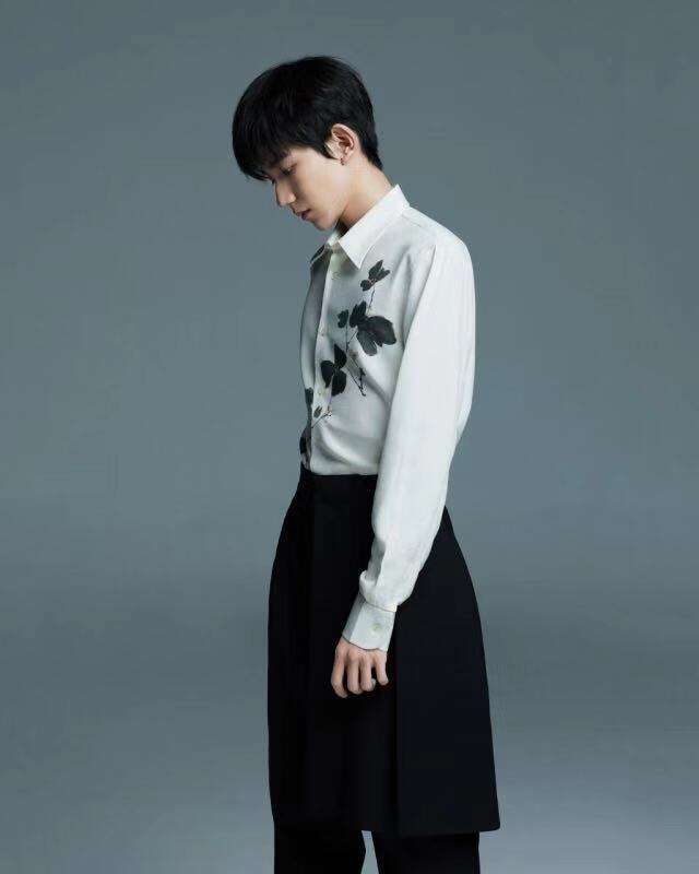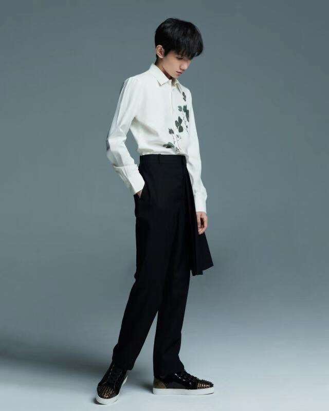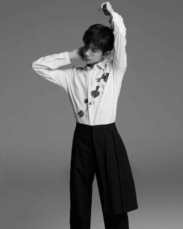 水墨枝叶印花衬衫搭配解构设计西裤,简约恒久也不失艺术气息。