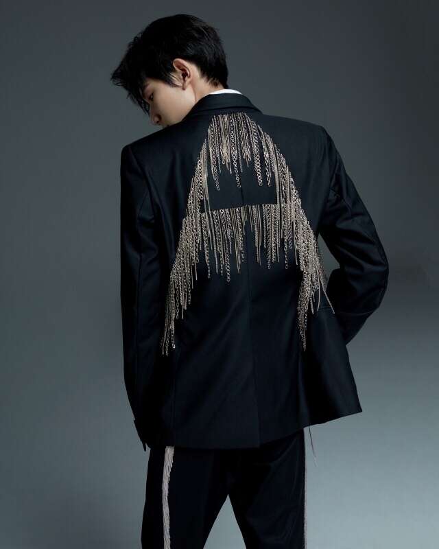 金属链条装饰西装内搭铆钉衬衫,全黑造型的摇滚形象是王源的又一次进阶。