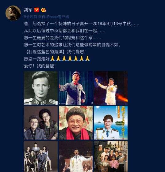 胡军在长文中写道“爸,您选择了一个特殊的日子离开—2019年9月13号中秋……从此以后每过中秋您都会和我们在一起……您一生最爱的是我们的妈妈和这个家……您一生对艺术的追求让我们这些做晚辈的自愧不如。【我爱这蓝色的海洋】我们爱您!”