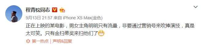 13日晚知名导演程青松发声吐槽:“正在上映的某电影,男女主角明明只有流量,非要通过营销号来吹捧演技,真是太可笑。只有金扫帚奖来扫他们了”,引来不少人的围观,随后更是在评论区里补充道:“豆瓣得分都跌到6分以下了,还有什么好说的。金扫帚奖恭候各位。”