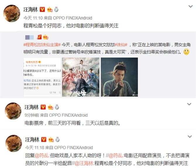从程青松导演的发言里,可以明显的看得出针对的电影正是刚刚上映的《诛仙》,对于这部戏,曾在国际电影比赛中屡获大奖的程青松导演自然有资格发声去评价,导演汪海林也发声支持,称吻戏是真吻,声音却是配音。