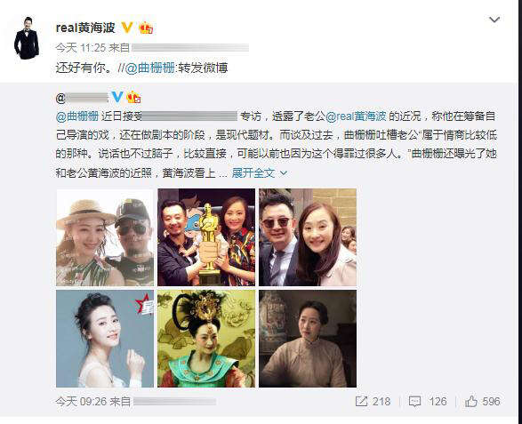 9月19日,黄海波在微博转发妻子曲栅栅的一则采访,并配文:还好有你。大方向妻子示爱。