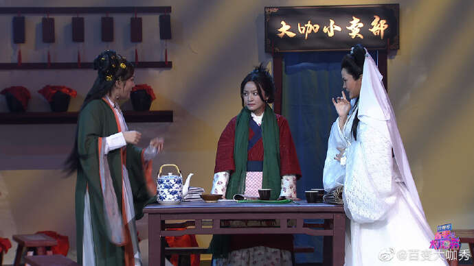 正如此前参加过喜剧类综艺的嘉宾刘胜瑛,喜剧演员出身的她在《百变大咖秀》的舞台上化身白娘子,在因各自心事而烦恼的思文版佟湘玉、大王版铁扇公主面前,来了次跨越次元的“凡尔赛”对话。而脱口秀演员、主持人出身的思文、大王,则发挥自身的天然优势,使其自然地融入了模仿中,将喜剧中的相关元素进行了价值最大化。
