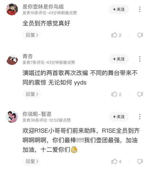 一公舞台的最后,师兄团R1SE的空降,更将现场气氛推至最高潮。没想到在《创造营》舞台上,还能再一次看到R1SE的现场表演,而且是《声声不息+曜》串烧,让创始人们仿佛回到去年追星现场,在酷狗评论区刷频表白:“全员到齐感觉真好!”