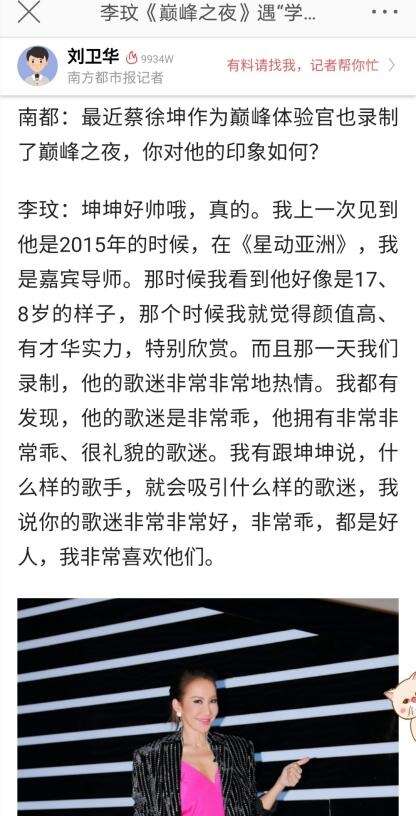 歌手李玟,在和蔡徐坤一起录制《巅峰之夜》之后,被采访时谈到蔡徐坤,对他的评价是,“在《星动亚洲》那个时候,我就觉得颜值高、有才华实力,特别欣赏,而且那一天我们录制,他的歌迷非常非常地热清,我都有发现,他的歌迷是非常乖,他拥有非常非常乖、很礼貌的歌迷。我有跟坤坤说,什么样的歌手,就会吸引什么样的歌迷。”