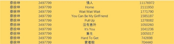 蔡徐坤被很多人喜欢的一点,就是他对自己有着相当清醒的认知。在当下偶像们集体朝着影圈、视圈、综艺圈拓宽发展的时候,蔡徐坤却在精心钻研着音乐。而首首优秀的音乐作品也充分体现他的创作实力,强势破圈,重新定义偶像魅力。他发布的原创单曲《YOUNG》、《WaitWaitWait》、《重生》等歌曲,都引起了不错的反响,单拿《情人》来细看,发行之初就登顶15项音乐榜单榜首,更是引发全民翻跳热潮,更有网友调侃“如果一个选秀综艺没跳过《情人》,说明可能这不是个正经选秀”,还有网友分享了华语流行歌手的歌曲在QQ音乐平台的收藏量等数据,其中《情人》发行一周收藏量破百万,发行九个月收藏量破千万,更是被夸赞“大众《情人》”。