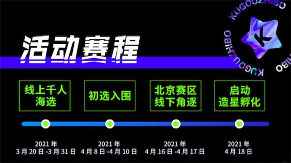 「酷狗直播猎音计划」分线上海选与线下角逐两个阶段。3月20日-3月31日,音乐人可准备好才艺作品,报名参加线上初选。4月16日,大赛将在北京赛区展开线下角逐,决出最终入围选手,启动全面造星流程。