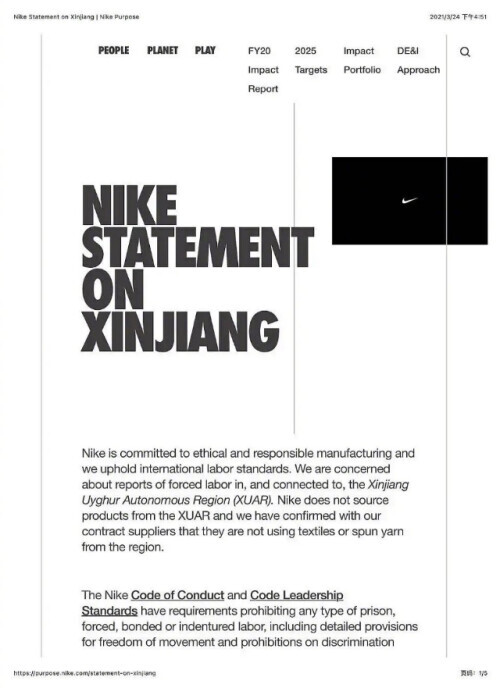日媒今年2月的报道称,优衣库、无印良品等12家日本公司拟与“已确认在中国新疆维吾尔自治区参与强迫劳动的中国公司”暂停交易;耐克也曾在官网发表声明,宣称它的供货商不使用任何来自大新疆地区的纺织物及其加工品。