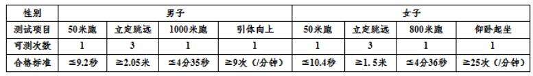 体能测评:项目和标准按照《国家学生体质健康标准(2014年修订)》的有关规定执行(3项达标即合格),具体项目如下: