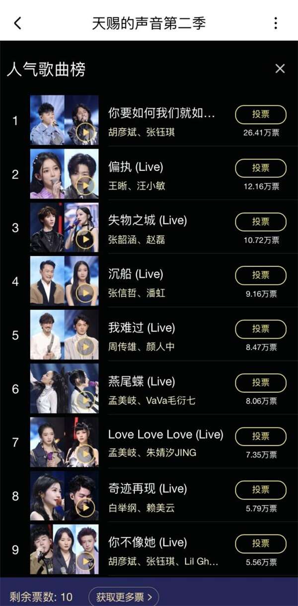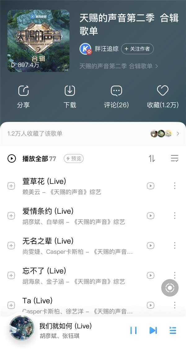 纵观酷狗《天赐的声音第二季》合辑歌单,胡彦斌也“贡献”出不少热评999+的金曲,《爱情条约》《不必在乎我是谁》等单曲直击网友内心。第四期胡彦斌和小鬼的合作舞台《解脱》直接飙上酷狗TOP500榜第七位,第八期他和张钰琪、小鬼强强联手带来的《你不像她》也拿下了酷狗天赐金曲榜第一名。