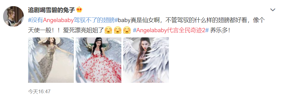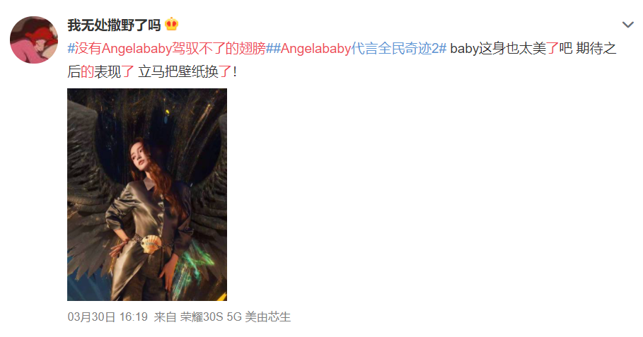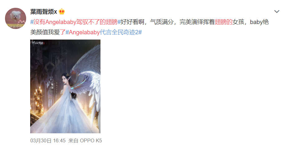 值得一提的是,《全民奇迹2》的经典羽翼符号在baby的演绎下格外灵动。代言海报一经释出,就引发了粉丝们的创作欲望,不少粉丝朋友们为baby戴上了各种不同样式的翅膀,纷纷表示“没有Angelababy驾驭不了的翅膀”。