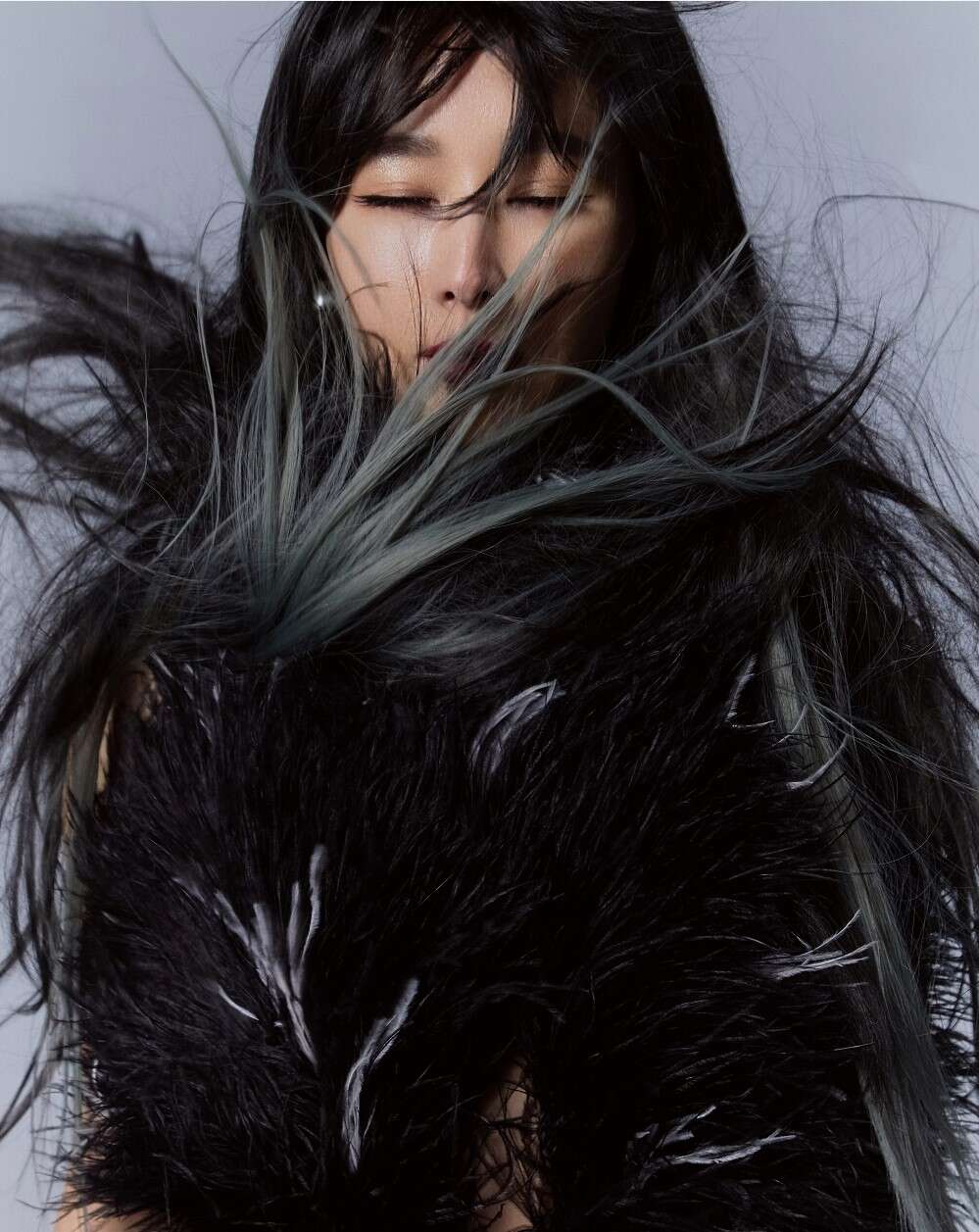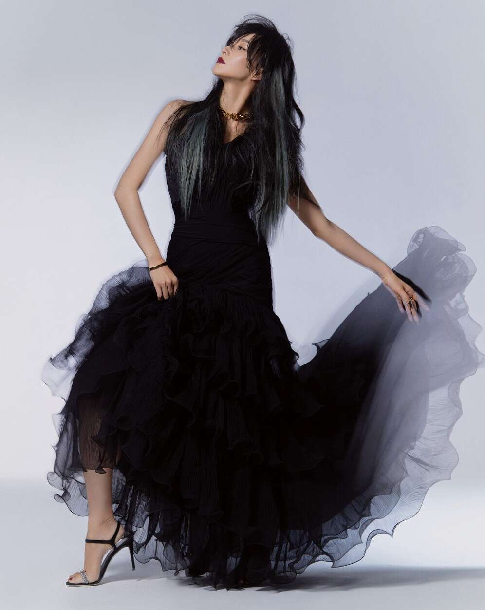 一袭黑色羽毛大摆长裙加上有些不规整的头发,胡静这身仿佛一位高傲的“黑天鹅”,黑色的冷酷与羽毛的柔软轻盈相结合,让这件裙子看起来多了几分灵动的气息,没有多余的首饰搭配,高级感十足。