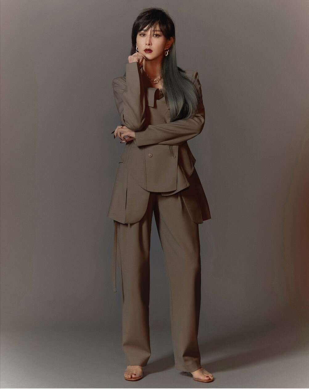 不得不说胡静好适合穿西装,卡其色西装套装简单低调,加上得体的剪裁设计,整个人大气十足,亚麻色的头发、暗黑系的妆容搭配上金属饰品的点缀,更加具有时尚感。