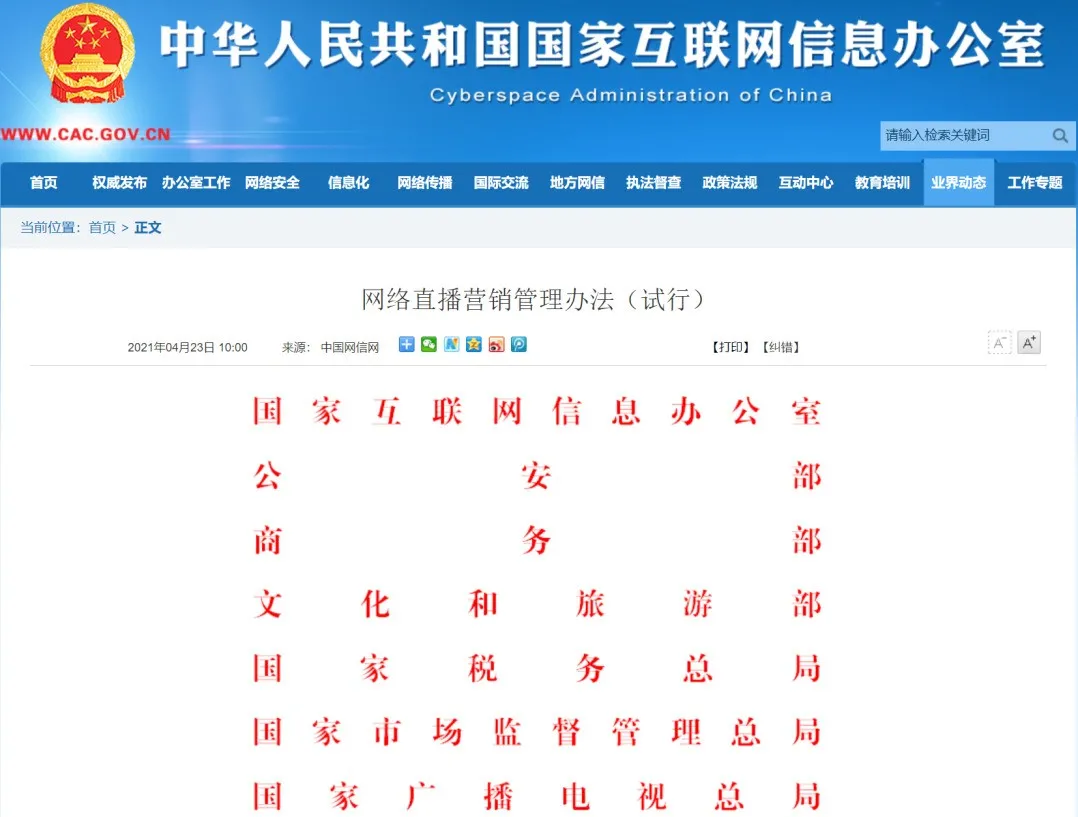 4月23日,据“网信中国”微信公众号消息,近日,国家互联网信息办公室、公安部、商务部、文化和旅游部、国家税务总局、国家市场监督管理总局、国家广播电视总局等七部门联合发布《网络直播营销管理办法(试行)》(以下简称《办法》),自2021年5月25日起施行。