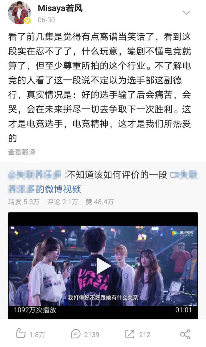 前英雄联盟职业选手“Misaya若风”直言:“编剧不懂电竞就算了,但至少尊重所拍的这个行业”。LPL主持人余霜则说:“电竞从开始到现在这么多年,从没有过这样的事情,也永远不会有。”
