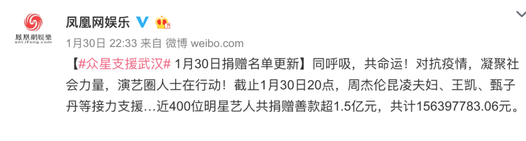 剧组停工,综艺停录,平时忙得分身乏术的明星们,这次也是被动的放了一个长假。没有活动的他们也没闲着,据媒体统计,近400位艺人累计为疫情捐款近1.5亿元。