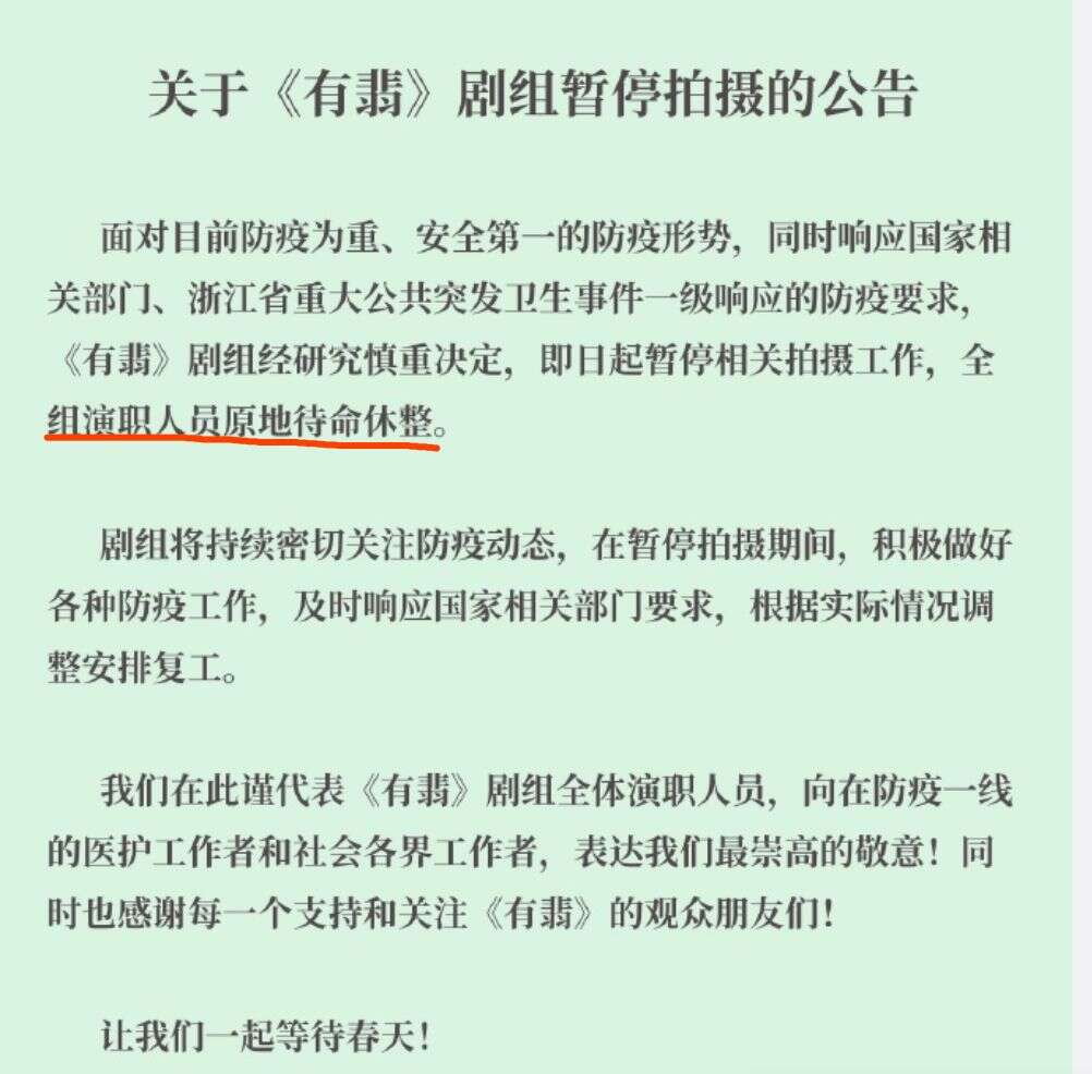 现在,什么时候复工还未可知,大热剧《有翡》《大江大河2》和观众见面的时间也将往后推。