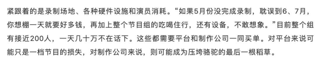 这样的做法在行业人看来,也是不得已而为之,毕竟综艺团队和剧组一样,场地人工都是成本,耽误了一天就得烧掉几十万。只能在合理的范围内,推进节目录制进程。