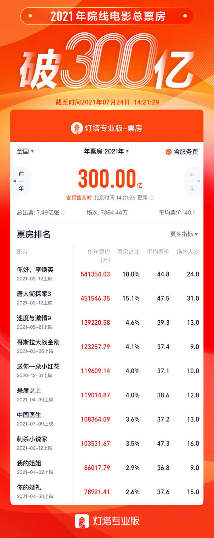 据灯塔专业版数据,截至7月24日下午14时21分29秒,2021年院线电影总票房(含预售)突破300亿,总观影人次达7.49亿,总场次7384.44万。