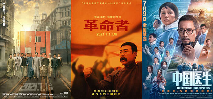 2021年票房破300亿,这个暑期还会有爆款吗? 《1921》《革命者》《中国医生》海报。