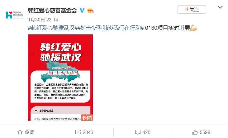 几天前,武汉某医院的工作人员发文透露最早收到韩红的募捐:目前来说!只收到了韩红的物资!而且是第一批明星物资!跟她微博也对的上数!真正的慈善家!好人!大爱!敬佩!