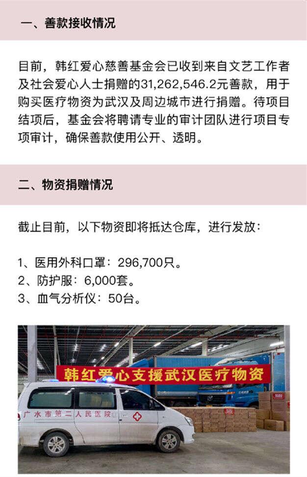 此外,韩红爱心慈善基金会已收到来自文艺工作者及社会爱心人士捐赠的31262546.2元善款,用于购买医疗物资为武汉及周边城市进行捐赠。物资方面,包括医用外科口罩296700只,防护服6000套以及50台血气分析仪,而以上诸多爱心,韩红方面也强调,基金会将聘请专业的审计团队进行项目专项审计,确保善款使用公开、透明。