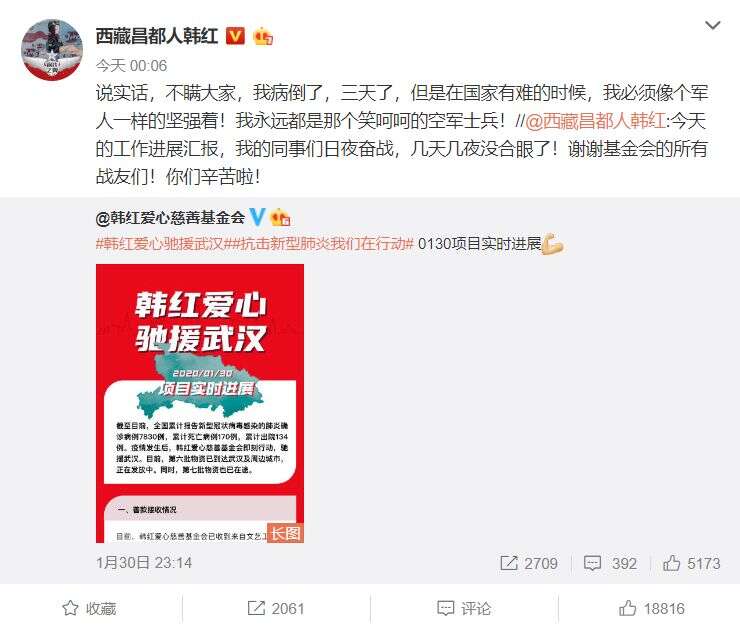 1月31日凌晨,韩红在微博上转发基金会的最新进展,在高兴之余,她也自曝已经病倒三天,但即使如此,韩红依然表示:“在国家有难的时候,我必须像个军人一样的坚强着!我永远都是那个笑呵呵的空军士兵!”