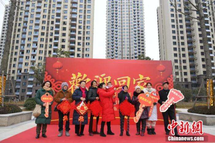 2021年12月28日,回迁居民代表在新小区内合影。当日,安徽省合肥市常青街道凌大塘社区回迁居民安置住房进入公开分配阶段,拆迁安置居民将陆续搬入配套完善的新型住宅小区。中新社记者 韩苏原 摄