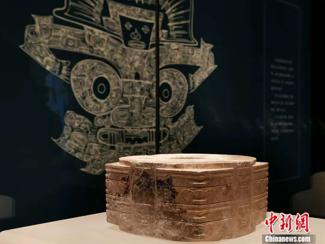 良渚玉琮及獠牙神面纹。中新社记者 杜洋 摄