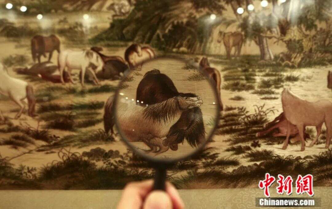 观众用放大镜观看以郎世宁《百骏图》为蓝本的苏绣作品。中新社记者 张浩 摄