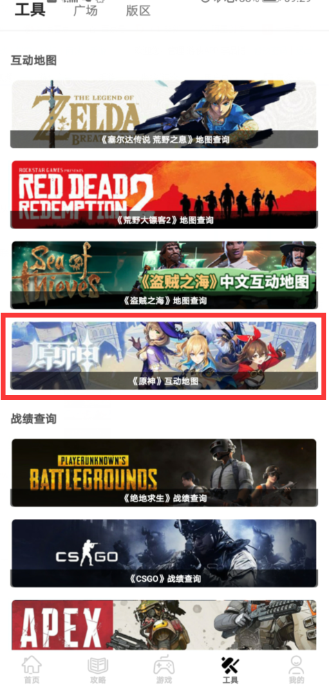 除了网页版,玩家还可以通过下载游侠APP随时随地查看《原神》互动地图。打开游侠APP,选择“工具”页面,即可使用。