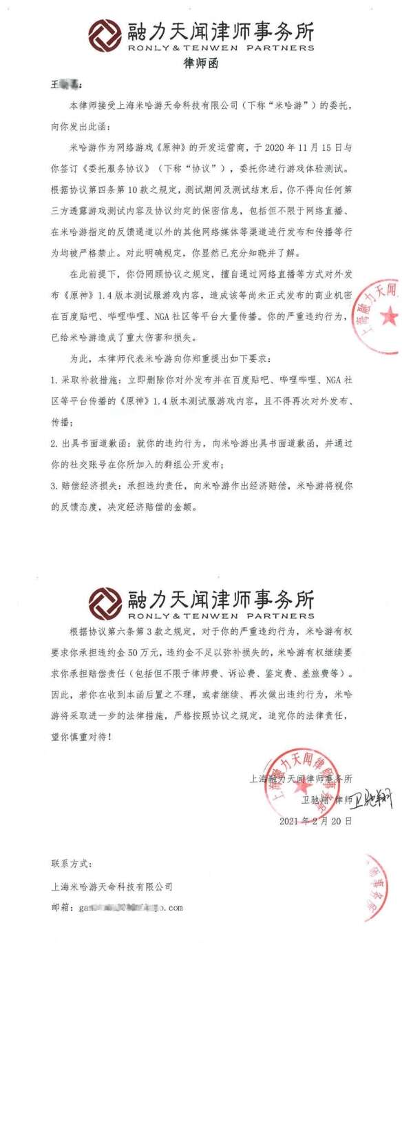 下图为其中一封已出具的律师函,我们已着手追究近期所有违规人员责任。