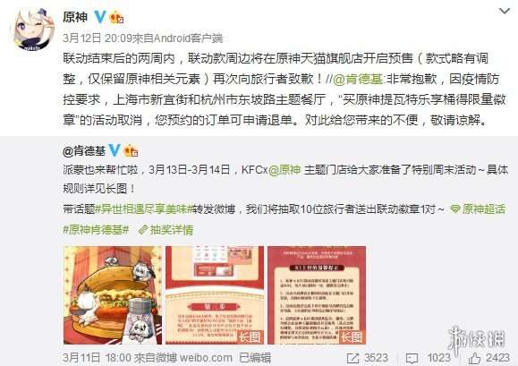 《原神》官方也转发了肯德基的致歉微博,并再次向玩家致歉,表示在联动结束后的两周内,联动款周边将在原神天猫旗舰店开启预售,不过款式略有调整,仅保留原神相关元素。