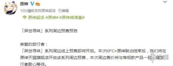 今日《原神》再次就此次的联动发文,预告了「异世寻味」系列周边的预售:“「异世寻味」系列周边线上预售即将开启。本次KFC×原神联动结束后,我们将在原神天猫旗舰店开放该系列周边预售,本次周边售价将与常规款产品一致,请旅行者耐心等待。”