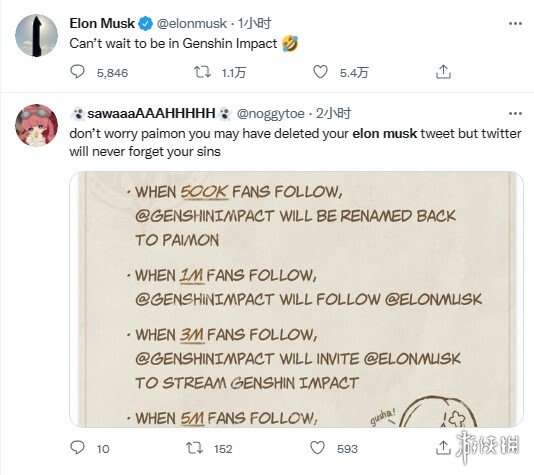 今天《原神》官方在推特上为了庆祝《原神》英文官方关注人数超过200万,将邀请SpaceX、特斯拉创始人兼CEO埃隆·马斯克做客米哈游总部,随后马斯克本人很快在推特上发文表示“自己已经迫不及待的想要玩《原神》了”。