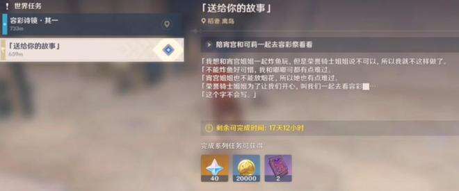 此外,可莉的嘟嘟可故事也很有料,这一段彩蛋内容被官方隐藏在《送给你的故事》任务描述中,可莉很体谅阿贝多哥哥不能陪伴,得知不能炸鱼时很难过,写到要去容彩祭时“祭”字不会写真是萌翻了。也难怪玩家们称宵宫可莉见面是老婆带女儿郊游,大家都喜欢通过这些方式来表达对宵宫、可莉的喜爱,也无时无刻不在表达对“女儿”可莉的宠爱之情。