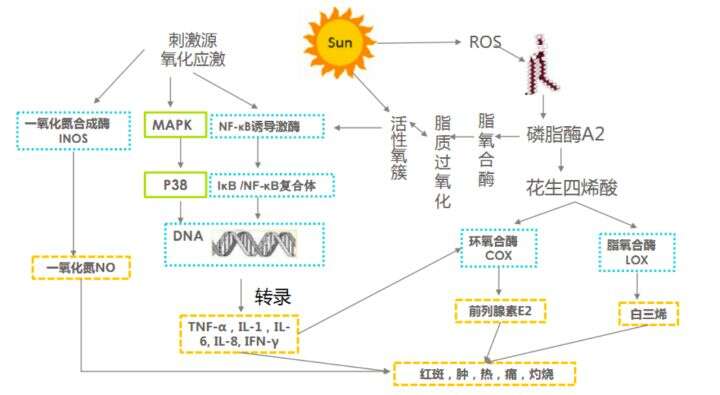 当我们的皮肤受到外界刺激,如化学物刺激,或者紫外线照射都会引发促炎性细胞因子释放,如白介素因子 IL-1α、IL-6、IL-8、TNF-α及干扰素IFN-γ等,这些因子除了造成表皮细胞损伤,还会引发皮肤的免疫细胞,如朗格汉斯细胞,淋巴细胞等释放炎性介质和细胞因子,这些物质共同造成局部反应。