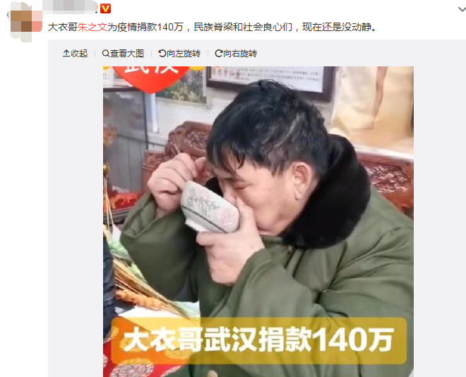 而除了演艺圈中的明星艺人,众多网红、草根艺人都纷纷挺身而出。1月31日,大衣哥朱之文就被拍到穿着标志性的军大衣、戴着口罩,手捧着一大摞百元钞票现身捐款,如此简单直接而又硬核的捐款方式确实颇为震撼。据悉这次大衣哥向武汉捐出的数额是20万元!