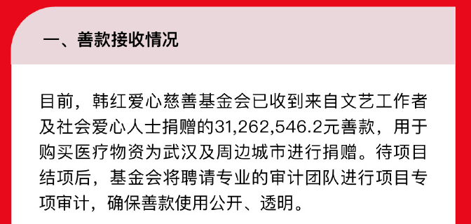 而且我们也欣喜地看到,像韩红所发起的韩红爱心慈善基金会,如今已经将第七批救援物资送到武汉人民手中,如此高效着实令人点赞。