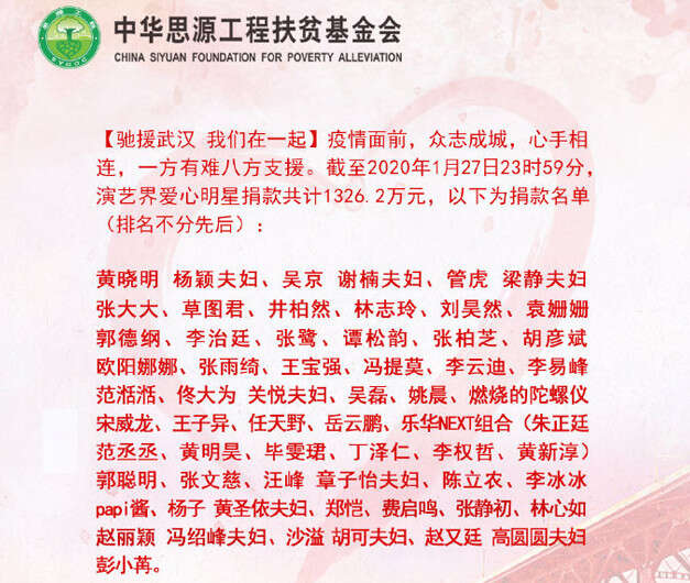 从武汉慈善总会以及其他各大慈善基金会的公开数据来看,已经有数百位明星艺人踊跃参与到爱心捐献之中,在这些名单中我们不光能看到吴亦凡、鹿晗、易烊千玺等众多顶流明星,同时一些不知名的艺人也列名其中,可以说在危难面前,演艺圈艺人们都纷纷竭尽所能为疫情发光发热献出一己之力。