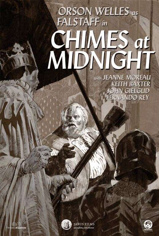 影片《午夜钟声》被很多人认为是莎士比亚戏剧改编中成就最高的一部,由莎士比亚的五部戏剧浓缩而成。讲述英国国王亨利四世即位后,全国判乱不止,形势动荡,王子却熟视无睹,与其密友胖武士弗斯塔夫终日豪饮作乐。弗斯塔夫是喜欢吹牛而无所不为之辈,他向亨利四世进谗言说王子平叛不力,把所有功劳归于自己。后来亨利四世驾崩,王子继位为亨利五世,弗斯塔夫以为自己能加官封爵,岂料被昔日旧友一脚踢开。原来亨利五世力图振作,那段放荡日子从此不复返,弗斯塔夫只得郁郁而终。导演用自己的方式重新诠释了这个小丑故事,但对他持同情态度,因为导演指出弗斯塔夫的行径正是他对抗日益改变的世界的护身符,从他与王子之间的友谊变化,影射出这个世界早已今非昔比,往日的骑士精神也因为强权政治的诡诈绝情而荡然无存……