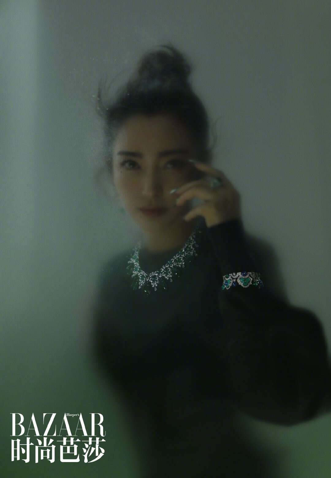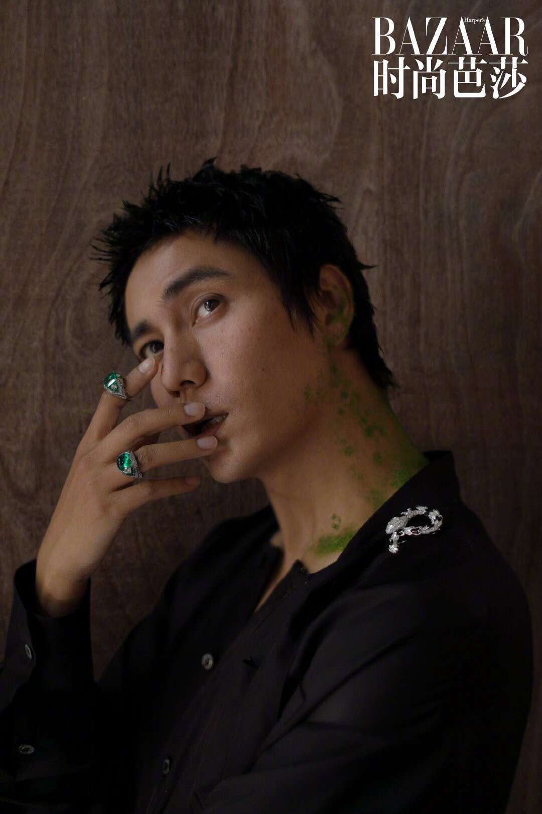 李冰冰虽然穿了一身黑,但配饰都是复古宝石绿。她的指甲、戒指、袖口刺绣以及脖子上所佩戴的项链,全都是墨绿色系的,正好与这期杂志的主题“一花一草一世界”相呼应。不愧是拿过影后的人,连拍杂志时眼神里都全是戏,表现力实在是太强了。