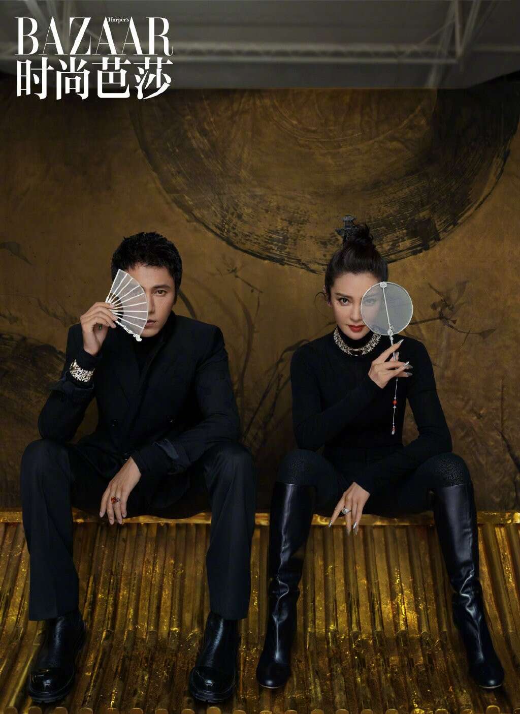 时尚芭莎封面图中,陈坤和李冰冰身着深色服饰坐在一起,两人手上都拿着袖珍扇子做装饰。陈坤身着一件藏青色西装,整个人看上去干练又帅气,颜值和魅力丝毫不减。李冰冰将头发全部盘起,搭配大气的妆容又酷又飒,气场丝毫不输一旁的陈坤,两人构成了一幅赏心悦目的风景。