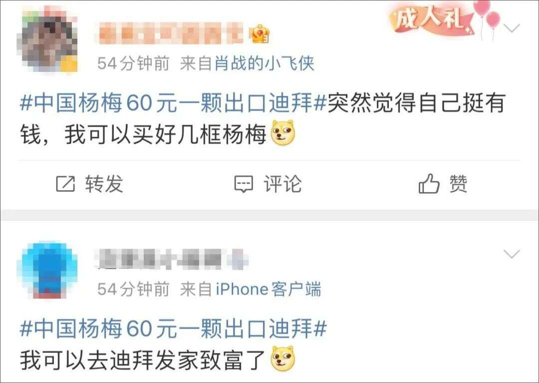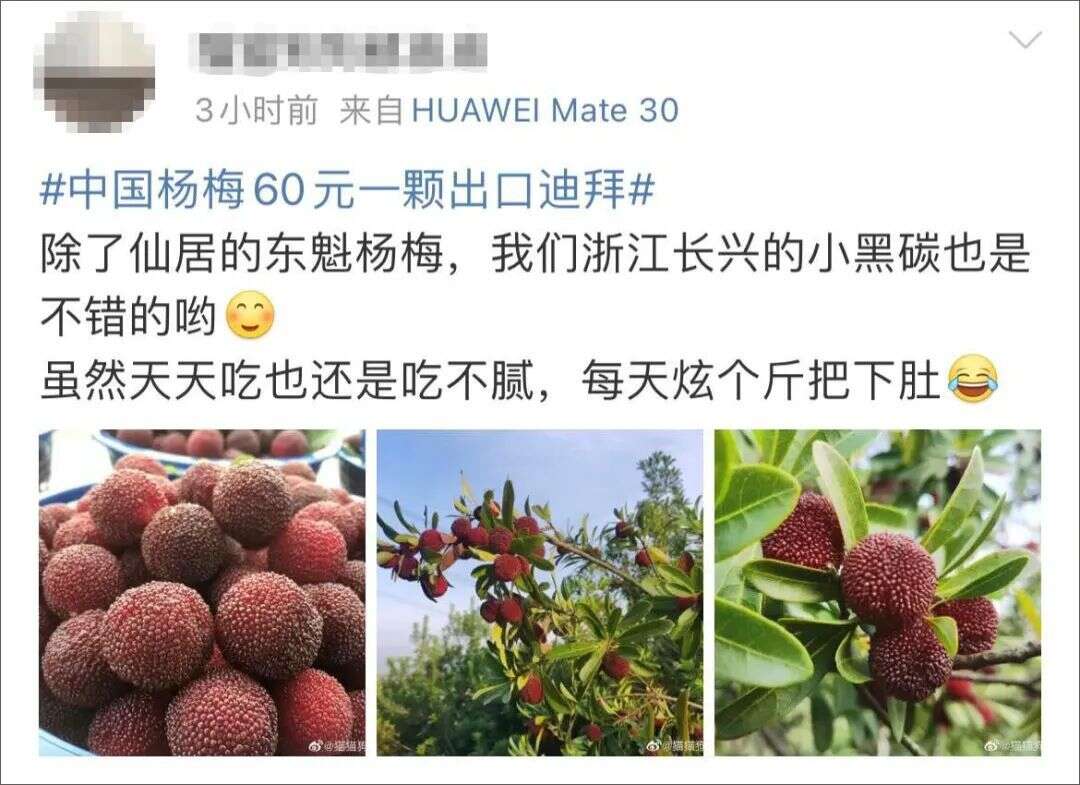 6月15日,#中国杨梅60元一颗出口迪拜#话题冲上热搜