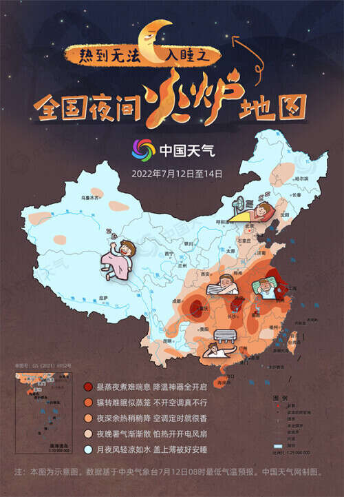 从四川盆地到江汉、江淮、黄淮南部、江南、海南等地,夜间最低气温都维持在28℃以上,加上夜间湿度更高,闷热感更明显,睡觉就像进蒸笼,空调也得24小时连轴转。