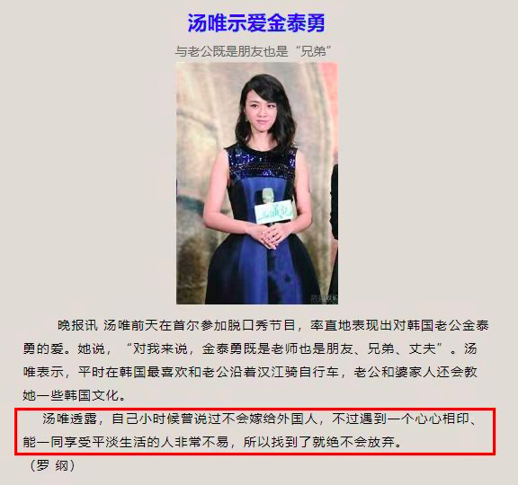 其实汤唯曾透露自己小时候就讲过以后不会嫁给外国人,但遇到了心心相印、能一同享受平淡生活的人非常不易,所有她这才没有放弃。