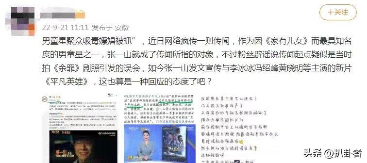 但4天前的爆料,只是引发了极小范围内的吃瓜热度,直到21号才开始爆发。有网友爆料说:男童星剧中吸毒嫖娼被抓!而根据网络传闻,张一山成了所指的对象。