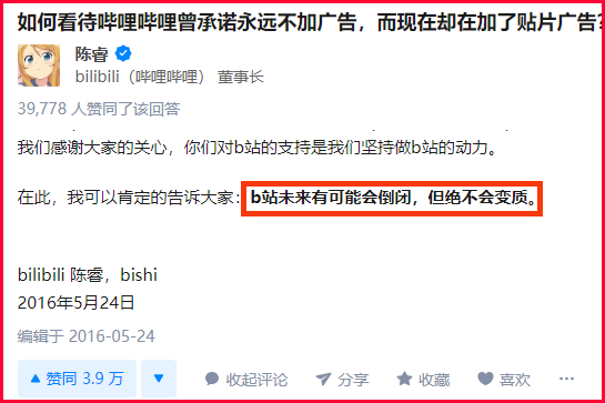 2016年,社交媒体上开始流传B站要加贴片广告的传闻,随后B站董事长兼CEO陈睿在知乎亲自发帖表示,“B站未来有可能会倒闭,但绝不会变质。”
